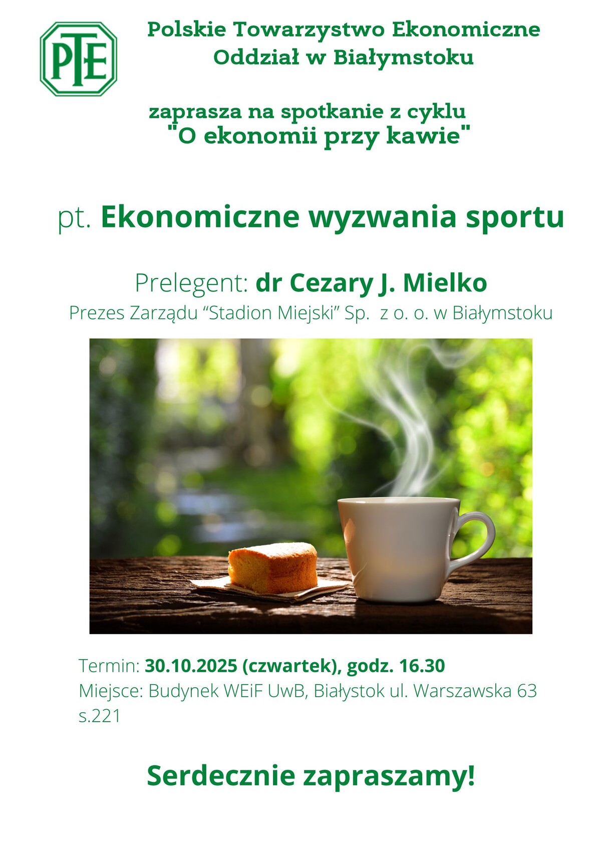 „Ekonomiczne wyzwania sportu” to temat kolejnego spotkania z cyklu „O ekonomii przy kawie”, które odbyło się 30.10.2025 roku. Głównym prelegentem był Pan dr Cezary Mielko, Prezes Zarządu Spółki „Stadion Miejski” Sp. z o.o. w Białymstoku oraz pracownik Wydziału Zarządzania UwB. W trakcie spotkania omówiono aktualną kondycję finansową stadionu. Zwrócono uwagę na czynniki odpowiadające za dobrą sytuację finansową spółki, w tym skuteczne zarządzanie, lepsze wykorzystanie przestrzeni obiektu, rozszerzenie oferty wydarzeń komercyjnych i kulturalnych, a przede wszystkim dobrą współpracę z klubem Jagiellonia Białystok. Dyskusji poddano także najważniejsze wyzwania i problemy związane z zarządzaniem obiektem finansowanym ze środków publicznych, zwracając uwagę na konieczność utrzymania przejrzystości finansowej oraz efektywnego wykorzystania funduszy miejskich. Prelegent przedstawił również plany rozwojowe stadionu, obejmujące m.in. modernizację infrastruktury oraz rozszerzenie oferty wydarzeń sportowych i kulturalnych.